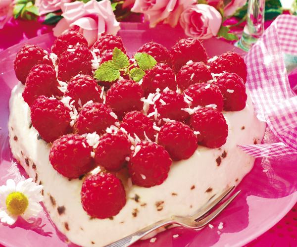 4. Se dă la congelator pentru 6 ore, apoi se scoate prin răsturnare şi se serveşte decorată cu zmeură şi nucă de cocos.