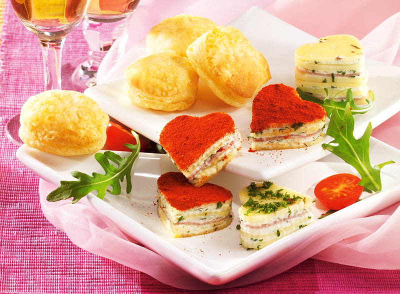 3. Se taie în formă de inimioare sau romburi şi se presară cu boia de ardei sau verdeaţă tocată mărunt. Toate resturile rezultate la tăiere se pun într-un castron şi se folosesc ca umplutură pentru pateuri.