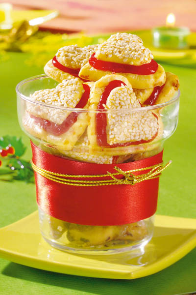 2. Aluatul se întinde într-o foaie groasă de 4-5 mm, din care se taie inimioare de două dimensiuni, mai mari şi mai mici. Se aşază într-o tavă tapetată cu hârtie de copt, se ung cu albuş de ou, iar inimioarele mici se presară cu susan. Se coc în cuptorul încins, la foc potrivit, 10- 12 minute.