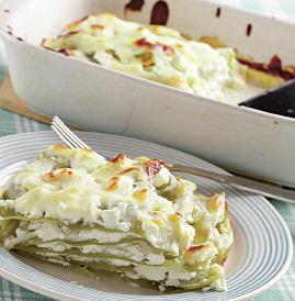 3. Se unge tava cu unt şi se tapetează cu pesmet, apoi se pune un rând de foi de lasagna, un rând din compoziţia de brânză, un rând de foi, brânză şi ultimul strat de lasagna. Înainte de a o băga în cuptor, se acoperă cu cele 3 ouă rămase, bătute spumă, împreună cu smântâna. Se bagă în cuptorul încălzit în prealabil şi se lasă aproximativ 60 de minute.