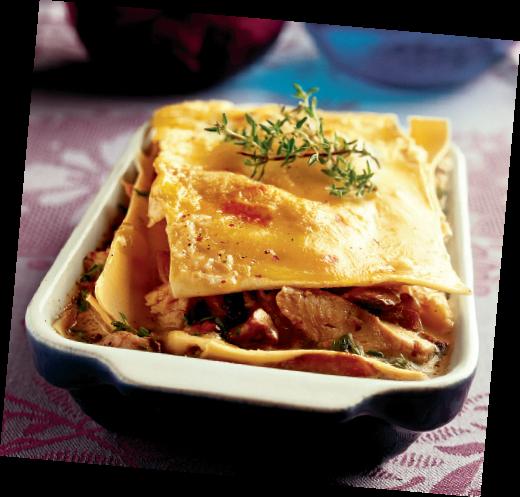 - Se unge cu puțin unt un vas termorezistent, apoi se pune o foaie de lasagna, un strat de carne de pui, unul de ciuperci, două linguri de smântână, sare, piper, cimbru și iar o foaie de lasagna, până se termină ingredientele. Se bagă la cuptor şi se lasă până se rumeneşte.