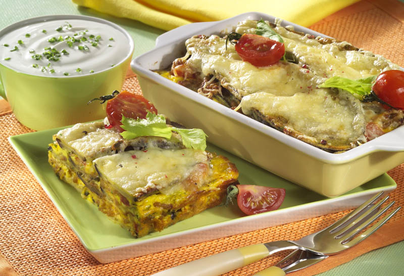3. Ceapa se căleşte în puţin ulei şi se adaugă carnea tocată, sarea, piperul, iar aopoi se pun la rece. Când compoziţia de carne s-a răcit, se adaugă oul şi pătrunjelul tocat mărunt şi se amestecă bine, până se omogenizează. Se pregăteşte tava cu unt şi cu puţin pesmet şi se aşază un rând de vinete, un rând de foi, peste care se presară caşcaval, un rând de carne şi tot aşa până se acoperă cu ultimul strat de vinete. Peste vinete se pun roşiile rondele şi caşcavalul ras.
