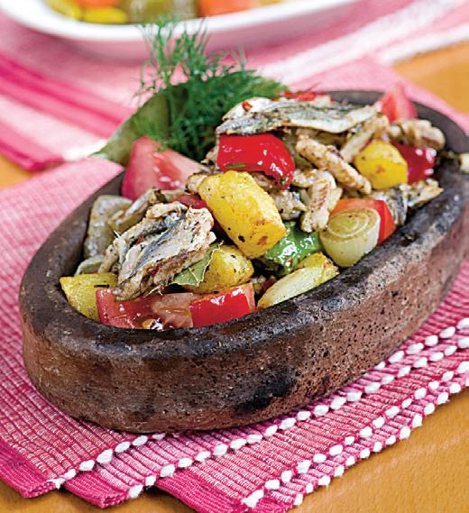 4. După ce s-au rumenit legumele, se scot, se lasă să se răcorească și se servesc cu macroul marinat. Se ornează cu fire de mărar și feliuţe de lămâie.