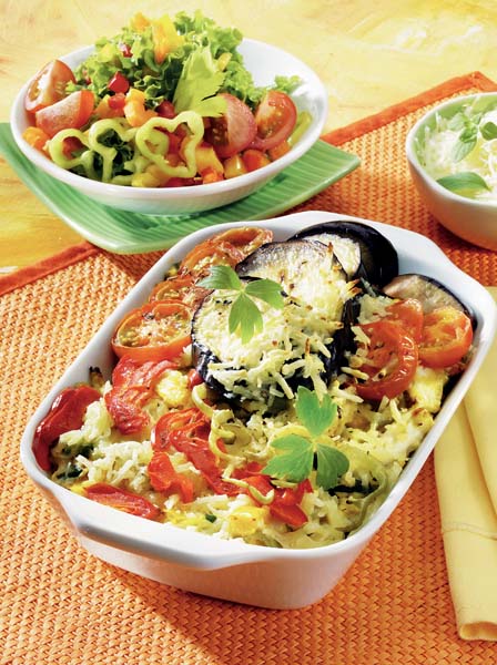 4. Astfel pregătite, legumele se coc în cuptorul încins, la foc potrivit, 30-40 minute. Cu puţin timp înainte de a fi gata, se presară brânză rasă şi pătrunjel verde tocat.