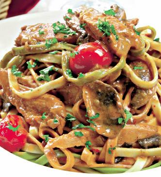 5. Pastele se pun într-un bol mai mare şi se amestecă cu sosul de ciuperci şi cu tonul. Se servesc ornate cu roşii cherry tăiate rondele, sau, după preferinţe, şi cu fire de pătrunjel verde.
