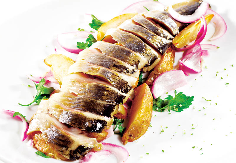 4. După ce s-a făcut macroul, se scoate pe un platou, se taie rondele şi se serveşte cu sosul de ceapă şi cartofii copţi. Se ornează cu frunze de salată verde şi pătrunjel verde.