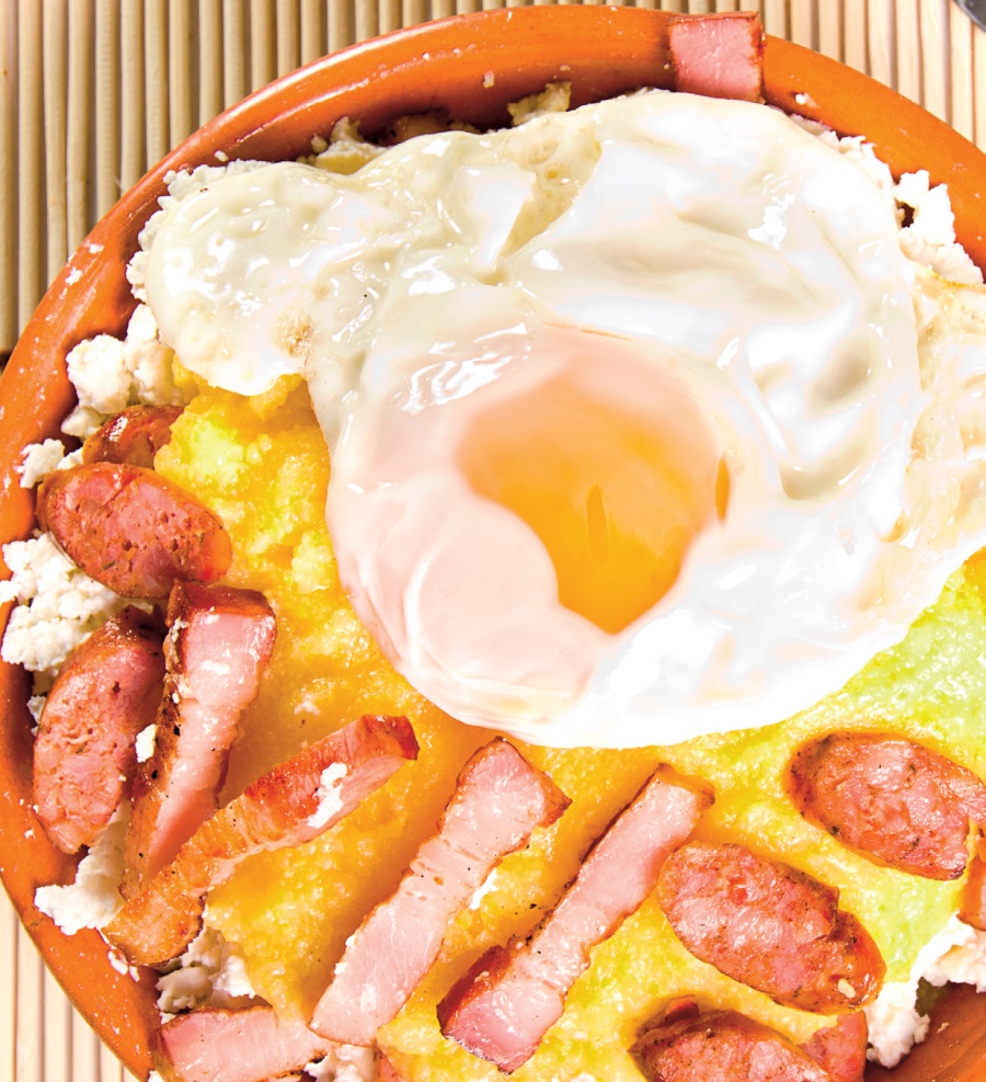 4. Ultimul strat trebuie să fie de mămăligă care se unge cu puţin unt. Se dă la cuptor pentru 30 minute. Se aduce la masă cu ouă ochiuri deasupra.