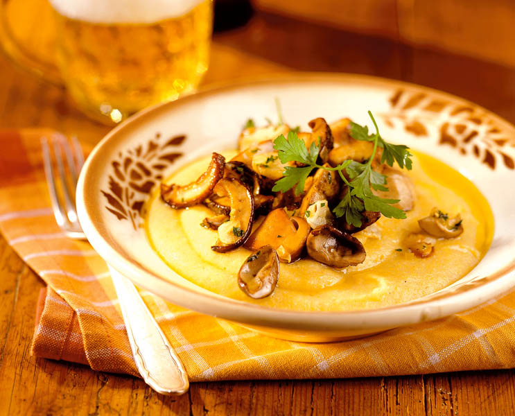 3. Ciupercile se curăţă, se spală şi se taie felii. Se călesc în ulei, apoi se adaugă usturoiul tocat şi se sting cu zeama de lămâie şi vin. Se lasă să fiarbă înăbuşit 25-30 minute şi se condimentează cu sare, piper şi verdeaţă. Se adaugă untul şi se servesc cu mămăliguţă caldă.