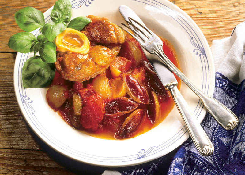 4. Se adaugă prunele şi se lasă să fiarbă la foc mic cu puţină apă. Pentru un gust bun şi un aspect plăcut, se bagă 10 minute în cuptorul încins în prealabil pentru a prinde o crustă aurie. Se serveşte ornată cu frunzuliţe de pătrunjel.