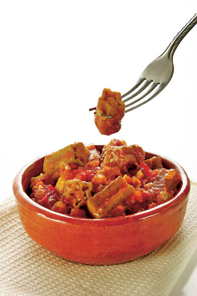 4. Roşiile se opăresc, se decojesc, se zdrobesc cu blenderul, iar piureul obţinut se pune în cratiţa cu bamele. Se lasă să dea în câteva clocote apoi se bagă în cuptorul încins, să scadă şi se servesc cu zeamă de lămâie şi ornate cu pătrunjel verde.