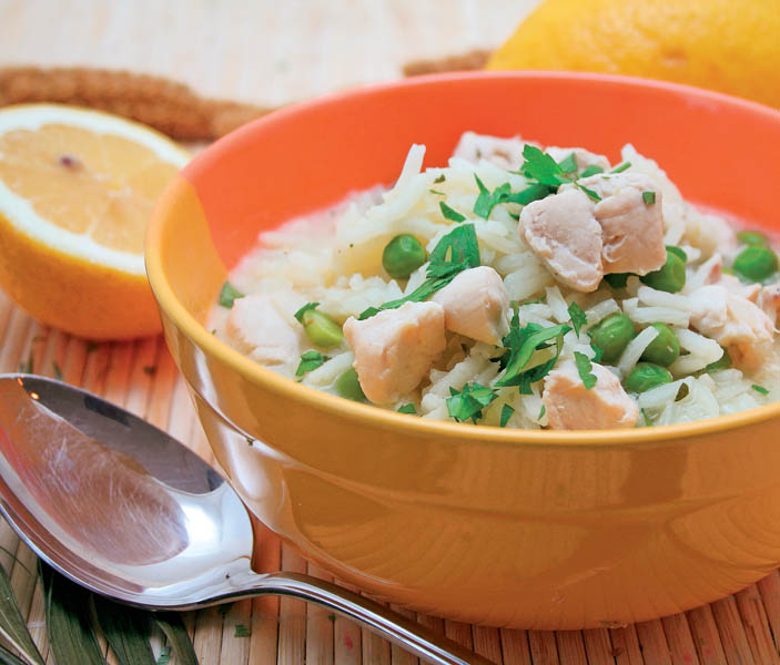 3. Se adaugă apă din când în când, se pune mazărea şi, spre sfârşit, se condimentează cu sare, piper şi un praf de şofran, un praf de nucşoară şi se lasă să mai fiarbă 5-10 minute.