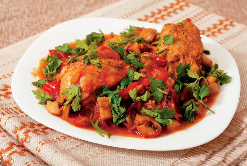 2. În uleiul rămas în tigaie se care se adaugă ceapa şi usturoiul fin tocate. Se lasă doar cât să se călească puţin şi se sting cu supa călduţă. Se fierbe acoperit 15 minute şi se răstoarnă peste bucăţelele de carne. Se adaugă sucul de roşii şi roşiile tăiate cubuleţe şi se fierbe în continuare, la foc mic, jumătate de oră.