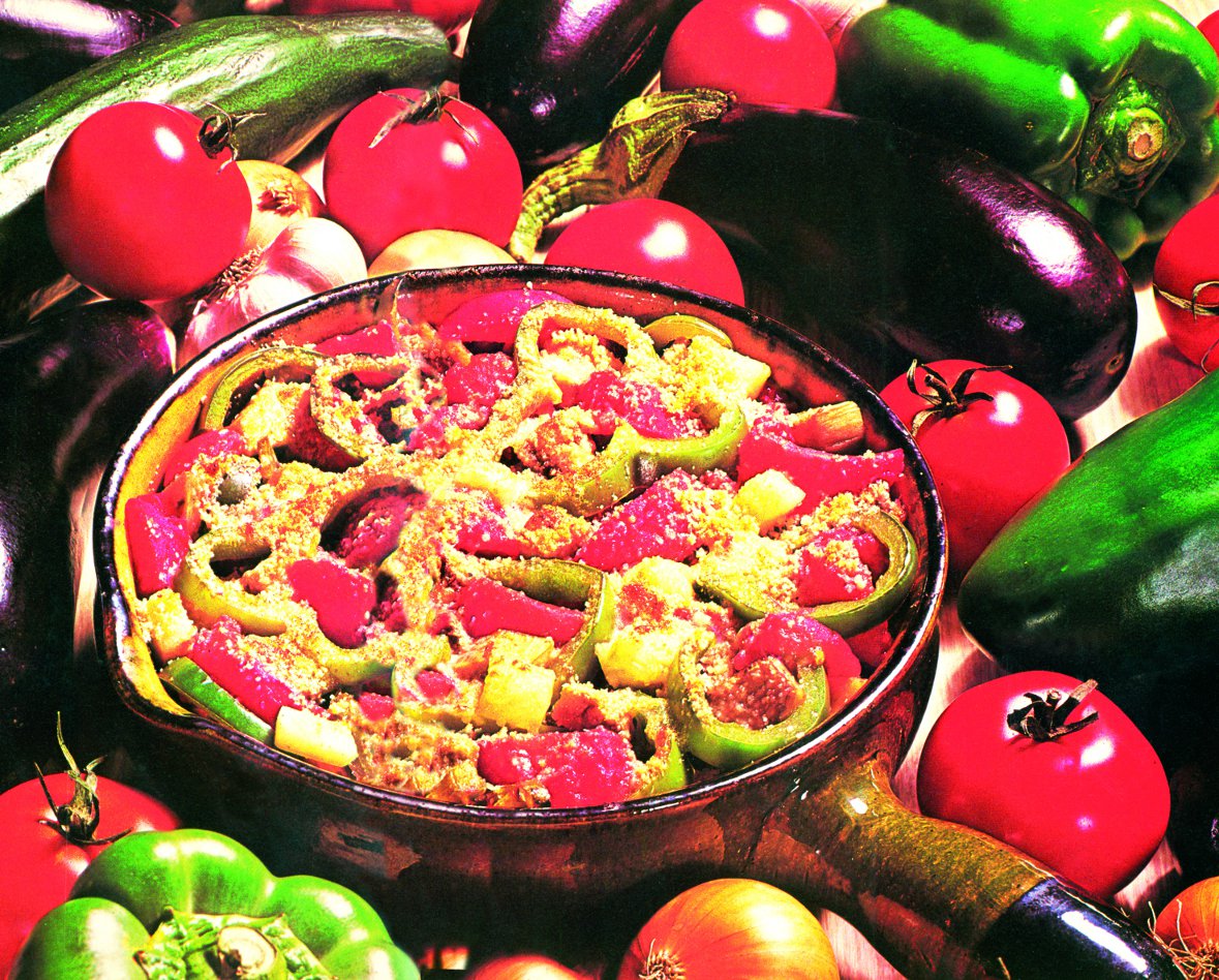 3. Se adaugă restul de roşii tăiate cubuleţe şi ardeiul gras tăiat rondele, se stropeşte cu ulei de măsline şi se pune în cuptorul încins, 25-30 de minute.