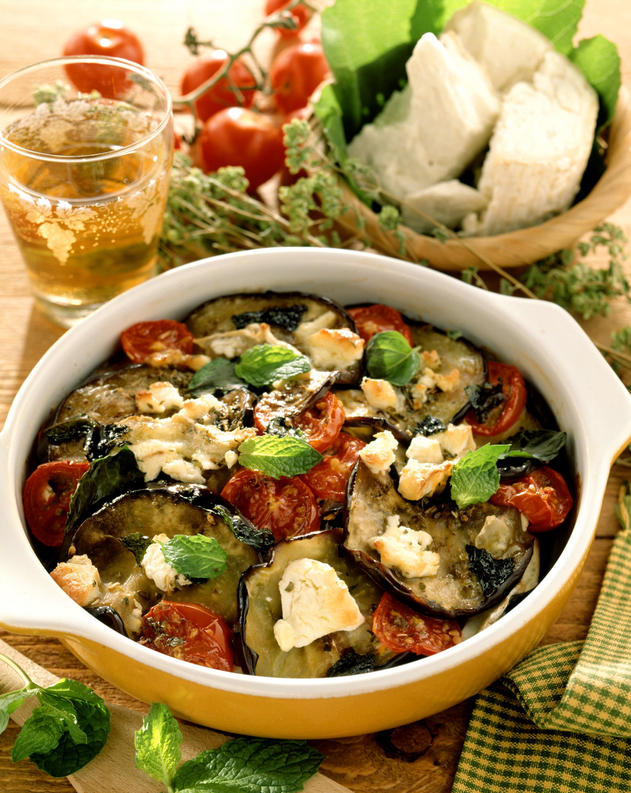 2. Legumele astfel pregătite se pun într-o cratiţă unsă cu ulei, aranjate în straturi, printre care se presară jumătate din brânză, mărunţită, usturoiul tocat mărunt, cimbru şi rozmarin tocate mărunt, sare şi piper. Se stropeşte cu puţin ulei, apoi se mai toarnă jumătate de pahar cu apă şi se coace în cuptorul încins, la foc potrivit, timp de 30 de minute.