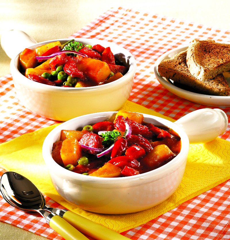 3. Separat, se curăţă ardeii, dovleacul şi gogoşarii şi se taie rondele. Legumele se adaugă peste carne şi se lasă să mai clocotească câteva minu­te. Se pun foile de dafin şi crenguţele de cimbru şi se acoperă cu un capac.