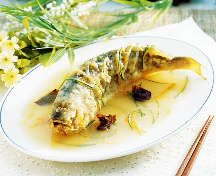 4. Se toarnă acest sos marinat peste bucăţile de peşte prăjit, puse într-un castron, având grijă să fie acoperite toate bucăţile de peşte. Se acoperă vasul, se păstrează la rece 1-2 zile şi se serveşte la aperitiv.