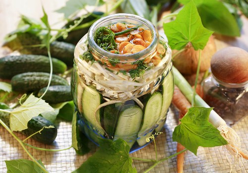 4. Într-un borcan încăpător, se aşază frumos, vertical, feliile de castraveţi, printre care se pun căţei de usturoi uşor striviţi, crenguţe de mărar uscat şi rămurele de viţă. Se pun apoi batonaşele de ţelină şi rondelele de morcovi.