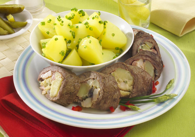 1. Se taie muşchiul de vită, se bate ca pentru şniţel, se unge cu ulei şi se condimentează cu boabe de muştar şi ienibahar. Se rulează şi se lasă câteva minute la frigider.