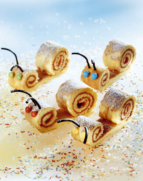 3. Blatul astfel rulat se lasă să se răcească, apoi se desface uşor, se unge cu gem de căpşune şi se rulează din nou. Se împachetează într-o hârtie şi se pune la rece minim o oră. Se taie fâşii de aproximativ 3 cm şi se ornează cu bomboane, lemn dulce tăiat subţire pentru corniţe şi zahăr pudră.