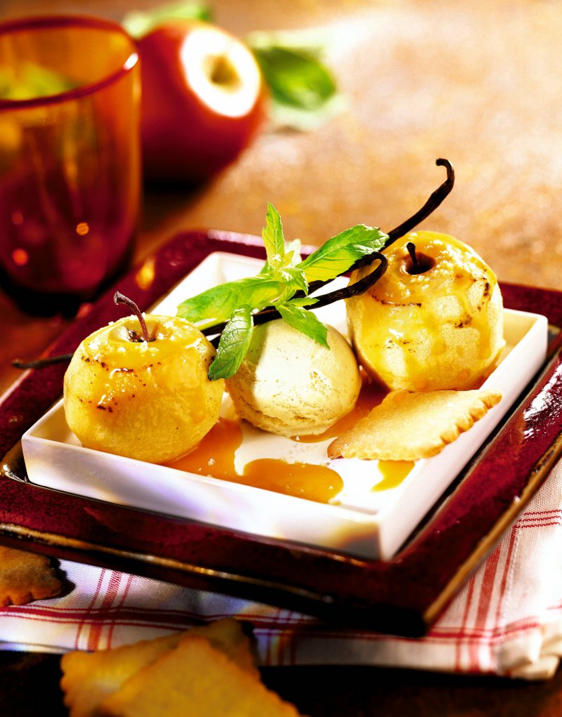 5. După ce s-a făcut îngheţata, se aranjează pe un platou, merele coapte, cupa de îngheţată şi se asezonează cu sosul de caramel şi o frunză de mentă.