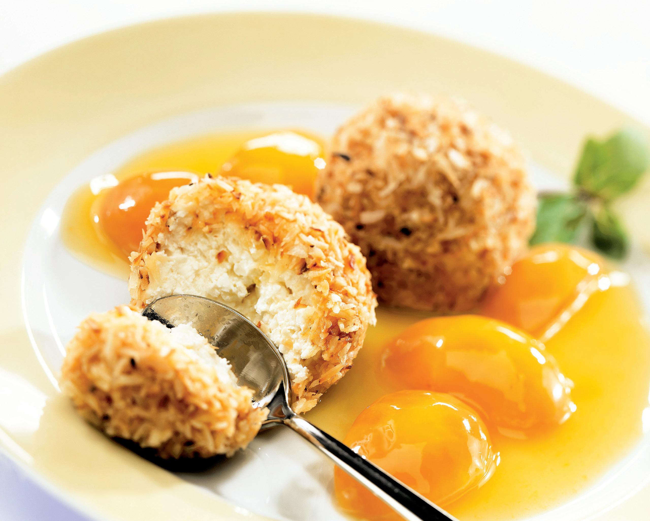 4. Se spală şi se curăţă de coajă piersicile, se taie în jumătăţi sau în sferturi, cum doriţi, şi se pun la fiert cu zahărul. După ce s-a răcit şi sosul de piersici, se aranjează pe platou sau boluri şi pe deasupra se aşază gogoşelele. Se ornează cu frunze de mentă.