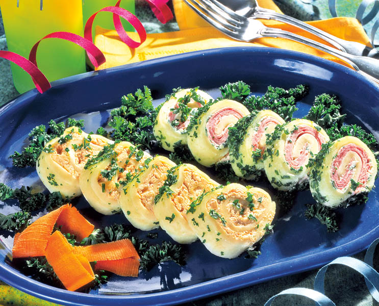 4. Se întinde crema de pui, se rulează clătita şi se aşază în tavă. Tot aşa se întâmplă şi cu pasta de brânză, se întinde pe foaia de clătită, se aşază feliile de şuncă şi se rulează. Se lasă la rece, se taie şi se servesc la aperitiv, ornate cu pătrunjel verde.