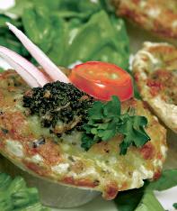 4. Compoziţia se toarnă în forme speciale, tapetate cu hârtie de copt şi se bagă în cuptorul încins, în prealabil. După ce au crescut şi s-au rumenit uniform, se scot şi se lasă la răcorit câteva minute. Se ornează cu pătrunjel proaspăt şi rondele de roşii.