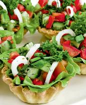 - Separat, se pregăteşte salata. Se spală ingredientele, se taie cubuleţe sau feliuţe subţiri şi se condimentează cu sare, piper, ulei şi oţet balsamic. Se amestecă bine şi se umplu mini tartele. Se ornează cu frunzuliţe de pătrunjel sau în funcţie de preferinţe.