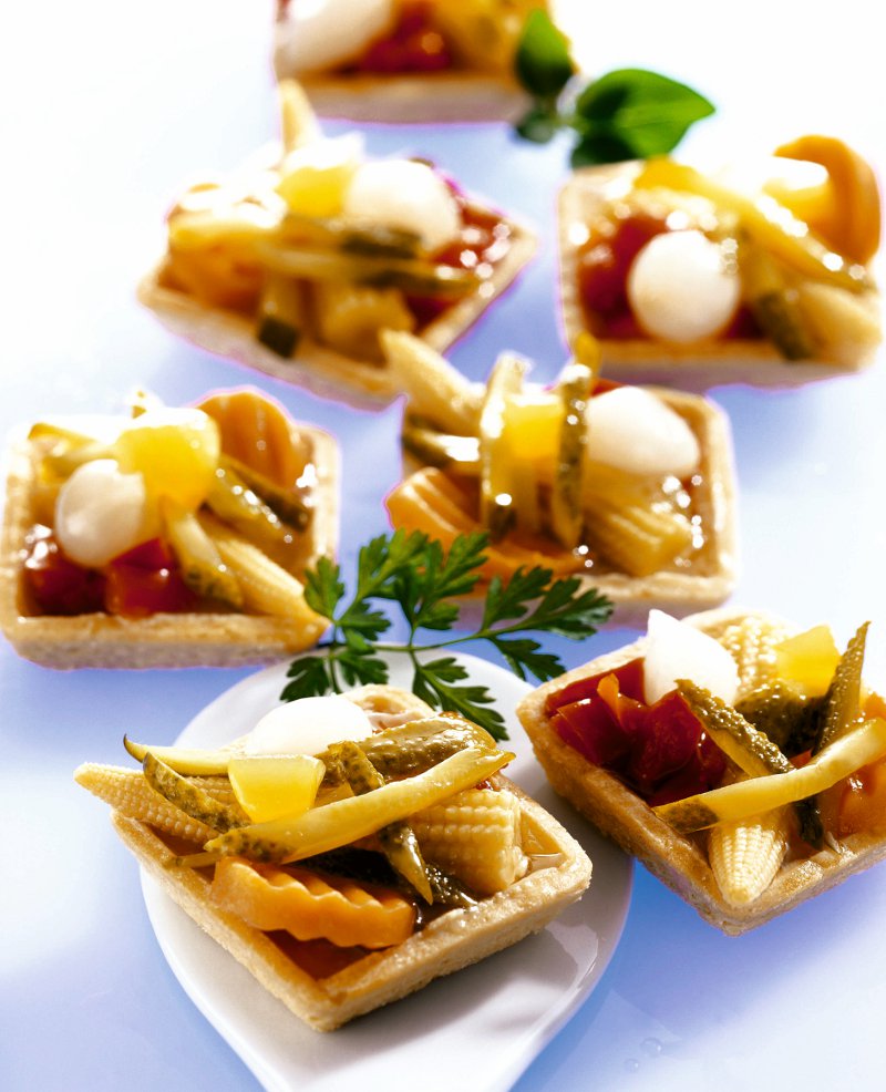3. Se scoate tava cu tarte din cuptor şi, cât sunt fierbinţi, se ornează cu murături asortate, decupate după imaginaţia fiecăreia. Se poate prepara şi o glazură din gelatină, dacă se doreşte un aspect mai pretenţios.