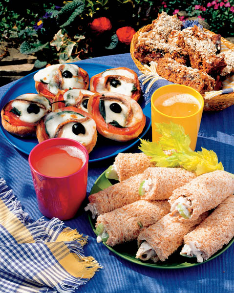 2. Pe fiecare bucată de chiflă se pune câte o felie de roşie, verdeaţă, o felie de mozzarella, o măslină şi câte o sardină.