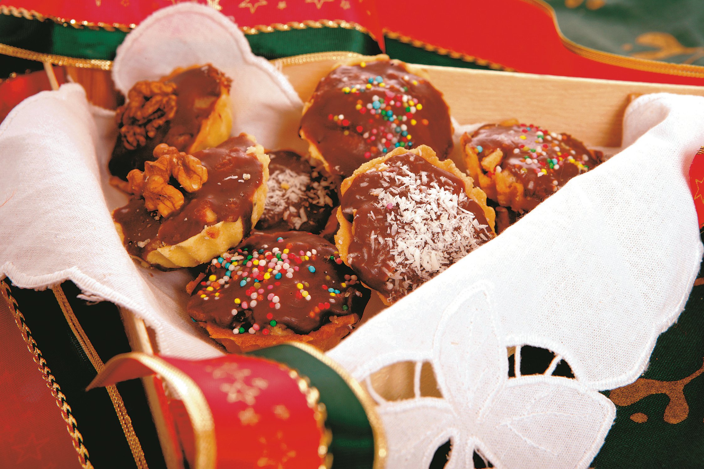 4. Se umplu tartele cu această cremă, apoi se acoperă cu glazură de ciocolată şi se ornează cu nuci, bombonele şi nucă de cocos.