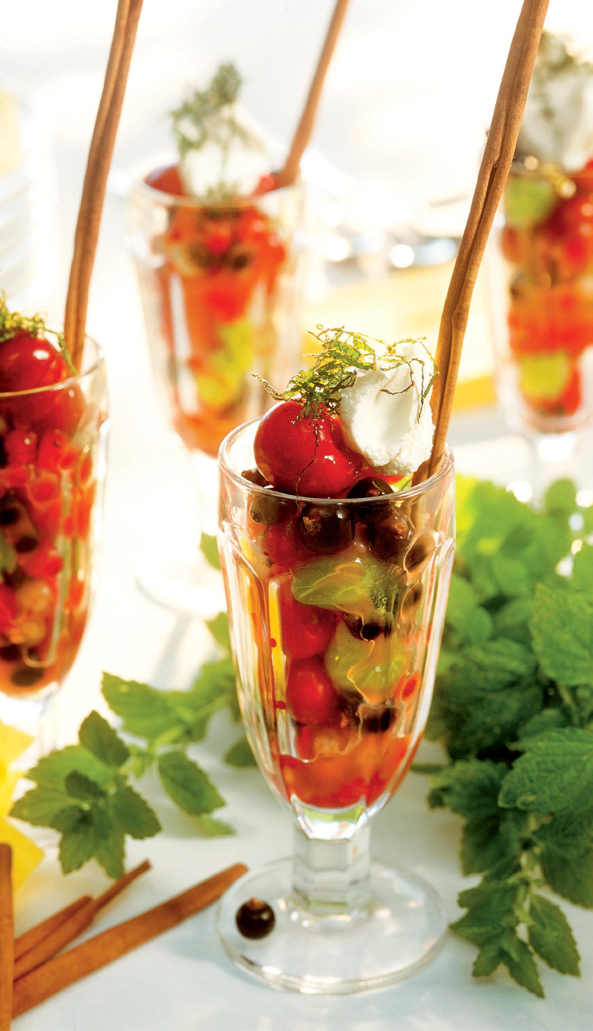 5. Cupele de salată se ornează cu frişcă, boabe de coacăze din compot şi frunze de mentă.