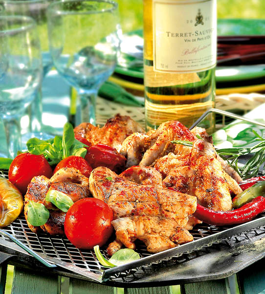 4. Peste crenguţe se aşază bucăţile de pui şi, după 10 minute, se întorc pe cealaltă parte. După ce s-au rumenit, (atenţie mare să nu se ardă), se servesc cu diverse garnituri şi salate asortate.
