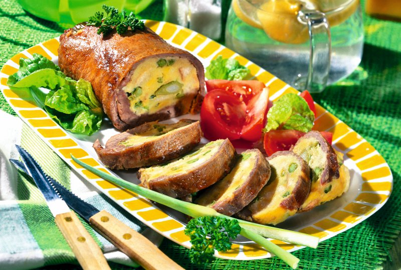 4. După ce s-a rumenit, se scoate din tavă şi se lasă câteva minute să se răcească. Se taie şi se serveşte pe frunze de salată verde ornată cu feliuţe de roşii.