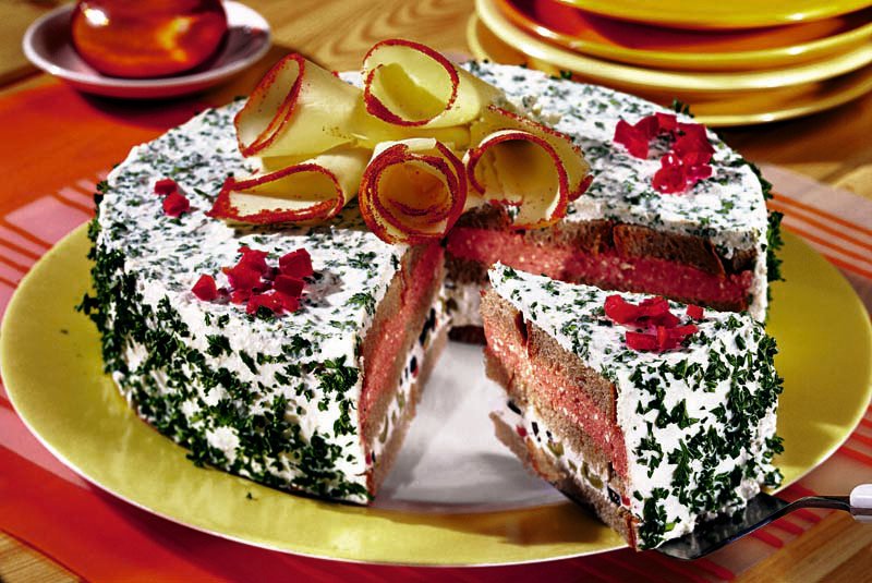 3. Între timp, se amestecă crema de brânză pentru decor cu mărar şi pătrunjel tocate fin. Se taie ardeiul roşu cubuleţe. La sfârşit, se “îmbracă” tortul cu crema de brânză, se netezeşte bine şi se ornează cu ardei roşu şi caşcaval cu boia.