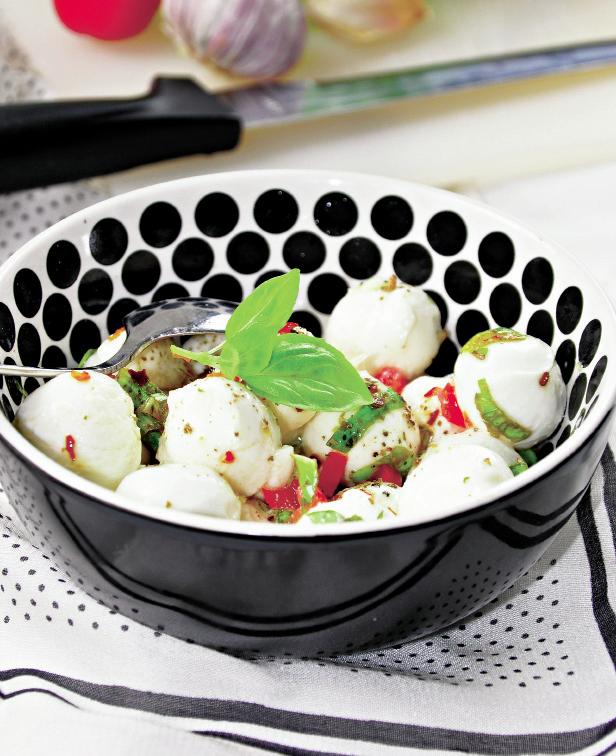 1. Pentru început, se scoate brânza mozzarella din cutie, se lasă să se scurgă de zer şi, dacă este bucată întreagă, se taie cubuleţe sau rondele.