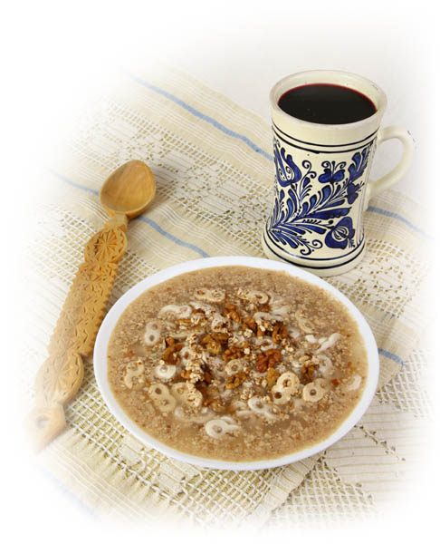 4. Separat, se prepară zeama. Se pune apa să fiarbă cu zahărul, se lasă să dea în câteva clocote, apoi se adaugă toate mirodeniile şi, la sfârşit, se pune nuca coaptă şi măcinată. După ce a clocotit bine zeama, se ia de pe foc şi se adaugă mucenicii.