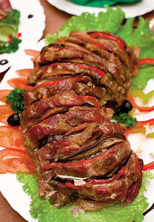 3. După ce s-au copt legumele, se intercalează cu feliile de carne, se condimentează cu sare, boia şi piper, se stropesc cu ulei şi unt topit şi se bagă din nou la cuptor.