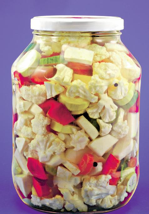 3. În borcanul bine spălat şi uscat, se aşază legumele asortate: conopida, morcovii, dovleceii şi ardeii. Printre murături se pun frunze de mărar şi boabe de piper negru.