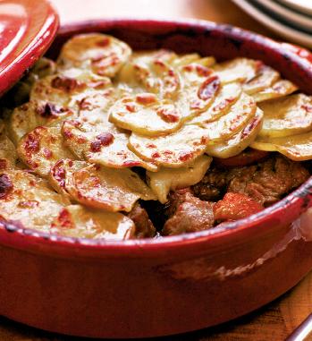 4. Se pune carnea într-o tavă de teflon şi se acoperă cu cartofii fierţi tăiaţi rondele. Se stropesc cu untul topit în prealabil şi se bagă în cuptorul cald. Musacaua se serveşte cu caşcaval sau cu smântână.