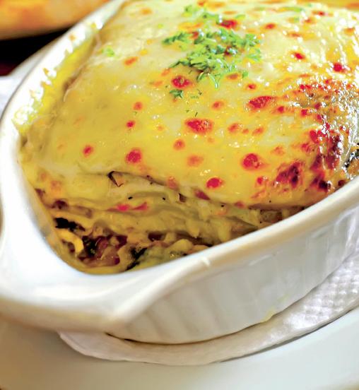 4. Se pune un strat de cartofi, ciupercile, ardei copţi, se toarnă un strat din compoziţia de brânzeturi şi tot aşa. Se acoperă cu compoziţia preparată şi se lasă la cuptor să se rumeneasă. Se serveşte ornată cu frunzuliţe de pătrunjel.