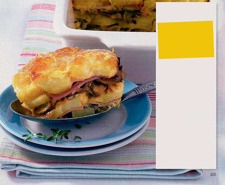3. Într-un vas uns cu ulei se presară pesmet şi se aşază straturi succesive de cartofi, şuncă presată şi ciuperci. Ultimul strat trebuie să fie de cartofi. Se toarnă deasupra ouăle bătute cu sare şi puţin piper şi se presară caşcavalul ras. Se pune apoi în cuptorul încins şi se gratinează jumătate de oră.