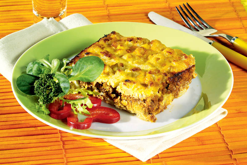 3. Se unge un vas termorezistent cu ulei, apoi se presară pesmet şi se pune jumătate din conopida fiartă tăiată cubuleţe. Se adaugă compoziţia de carne tocată şi se întinde într-un strat uniform. Deasupra se pune în strat restul de conopidă tăiată cubuleţe şi se toarnă ouăle bătute cu smântâna, un praf de sare şi piper. Se coace în cuptorul încins, la foc potrivit, 30-40 minute.