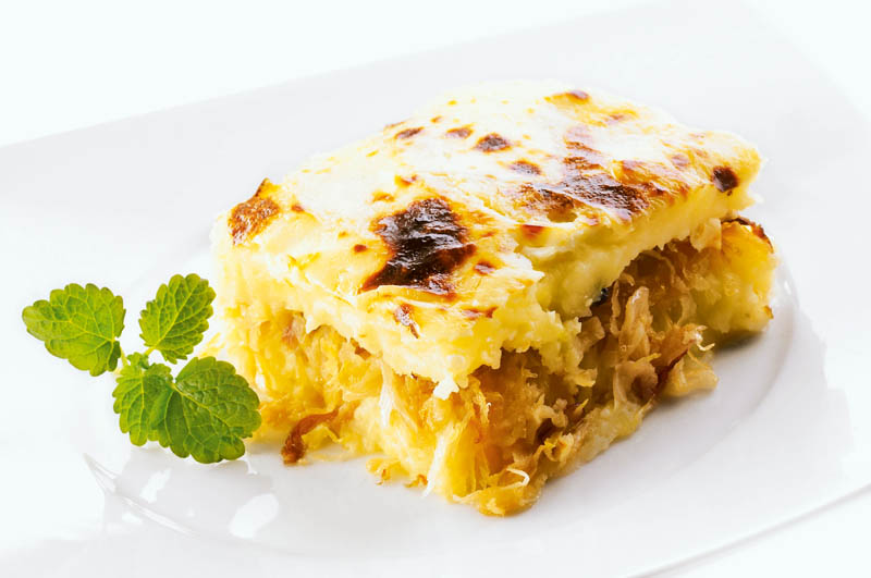 3. Jumătate din piure se pune într-un vas tapetat cu unt şi pesmet, apoi se unge cu un strat de unt, se pune varza călită şi restul de piure. Se unge cu unt şi se coace în cuptorul încins, 30 minute.