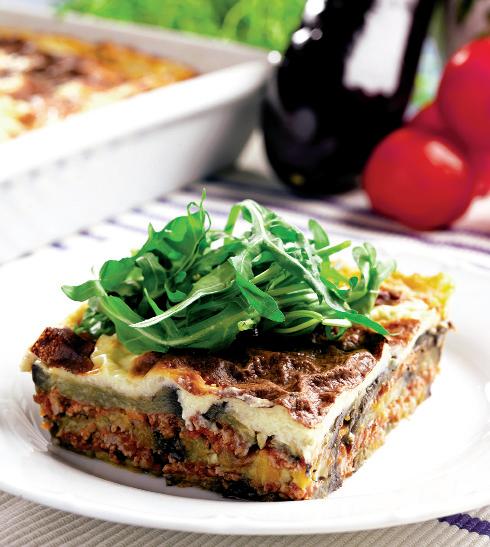- Se tapetează tava cu unt şi pesmet şi se toarnă un strat de piure, un rând de caşcaval ras, un strat gros de vinete cu roşii, un strat de piure, unul de caşcaval şi ultimul strat de piure. Se întinde uniform compoziţia, se presară caşcaval pe deasupra şi se bagă în cuptorul cald. Se serveşte ornată cu frunze proaspete de rucola.