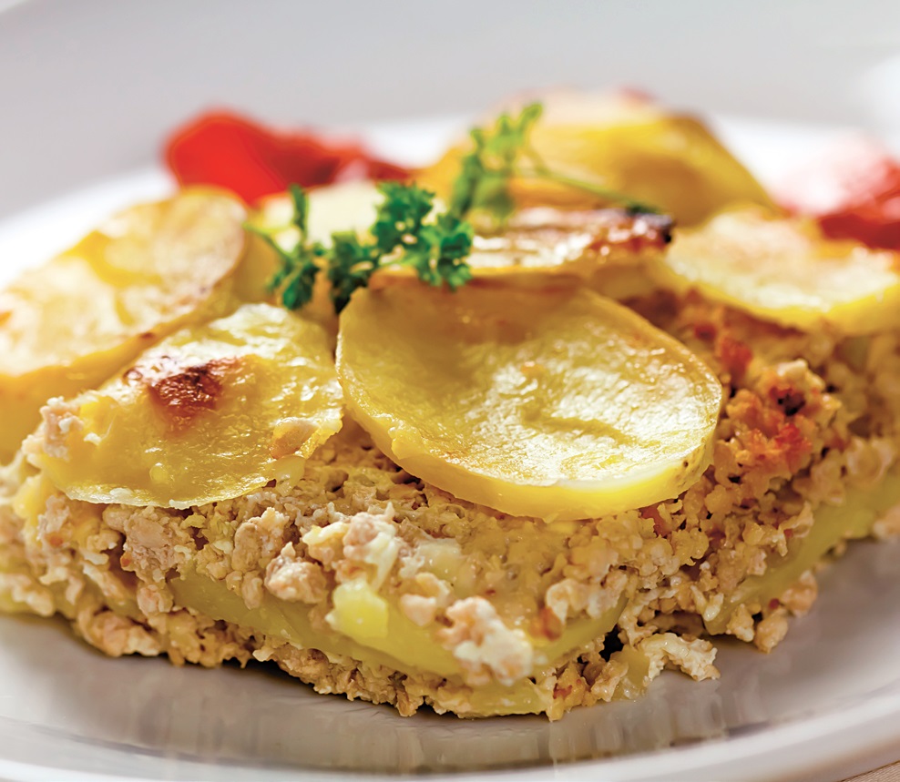 3. Într-o tavă de cuptor se aşază alternativ un strat de cartofi şi unul carne. Ultimul strat se alcătuieşte din felii de roşii.