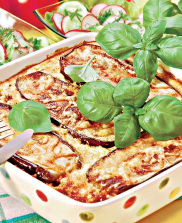 4. Se tapetează o tavă de ceramică cu ulei şi pesmet, se aşază un rând de vinete, unul de caşaval ras şi unul de carne şi tot aşa, iar pe deasupra, se toarnă sosul pregătit din smântână, oul bătut şi brânza feta. Se bagă în cuptor şi se lasă aproximativ 60 de minute. După ce s-a rume-nit, se serveşte ornată cu caşcaval de oaie şi frunze de busuioc verde.