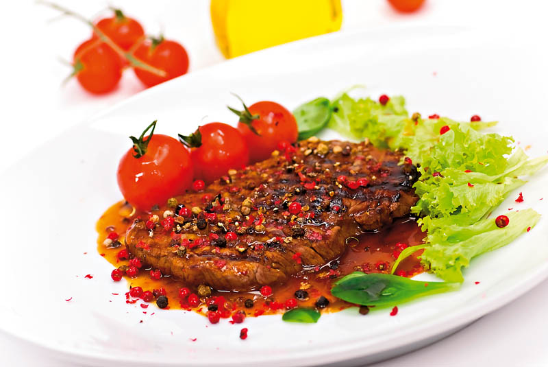 4. Se pun pe grătar bucăţile de carne şi se lasă 3-4 minute pe o parte şi 3-4 minute pe cealaltă parte. Se scot pe un platou şi se stropesc cu sosul de roşii. Se servesc cu diferite garnituri şi vin roşu.