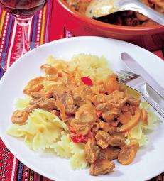 4. Pastele se condimentează cu sare şi cimbru. Se aranjează pe un platou şi se servesc împreună cu muşchiuleţul Stroganoff. Se ornează cu măghiran proaspăt.
