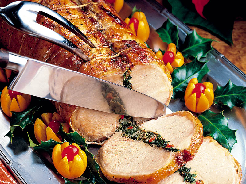 3. Cu această compoziţie se umple muşchiul de porc. Se leagă cu aţă şi se pune într-o tavă cu puţin ulei, câteva linguri de apă, sare şi piper. Se coace în cuptorul încins 60- 70 minute, până se rumeneşte frumos.